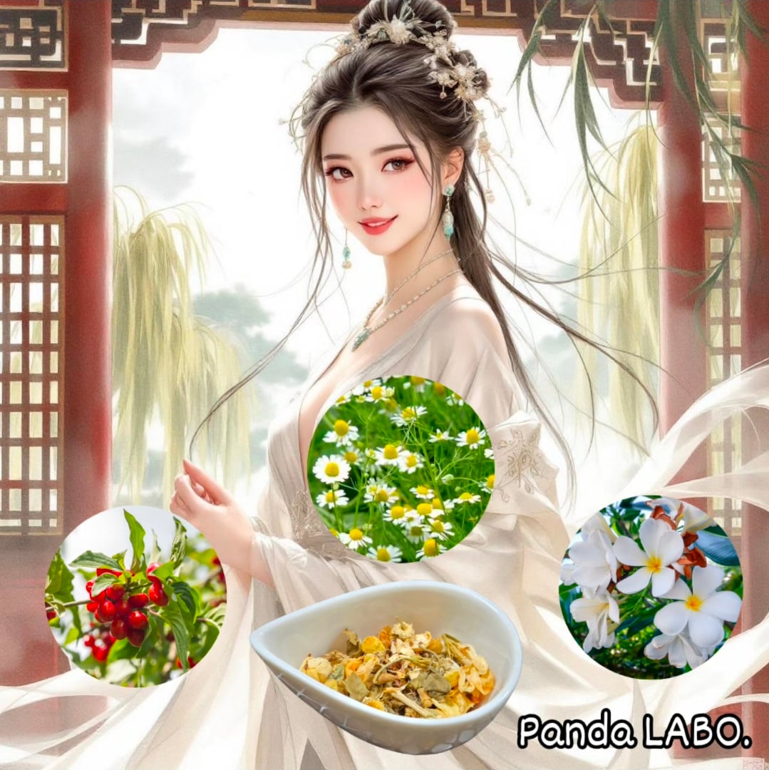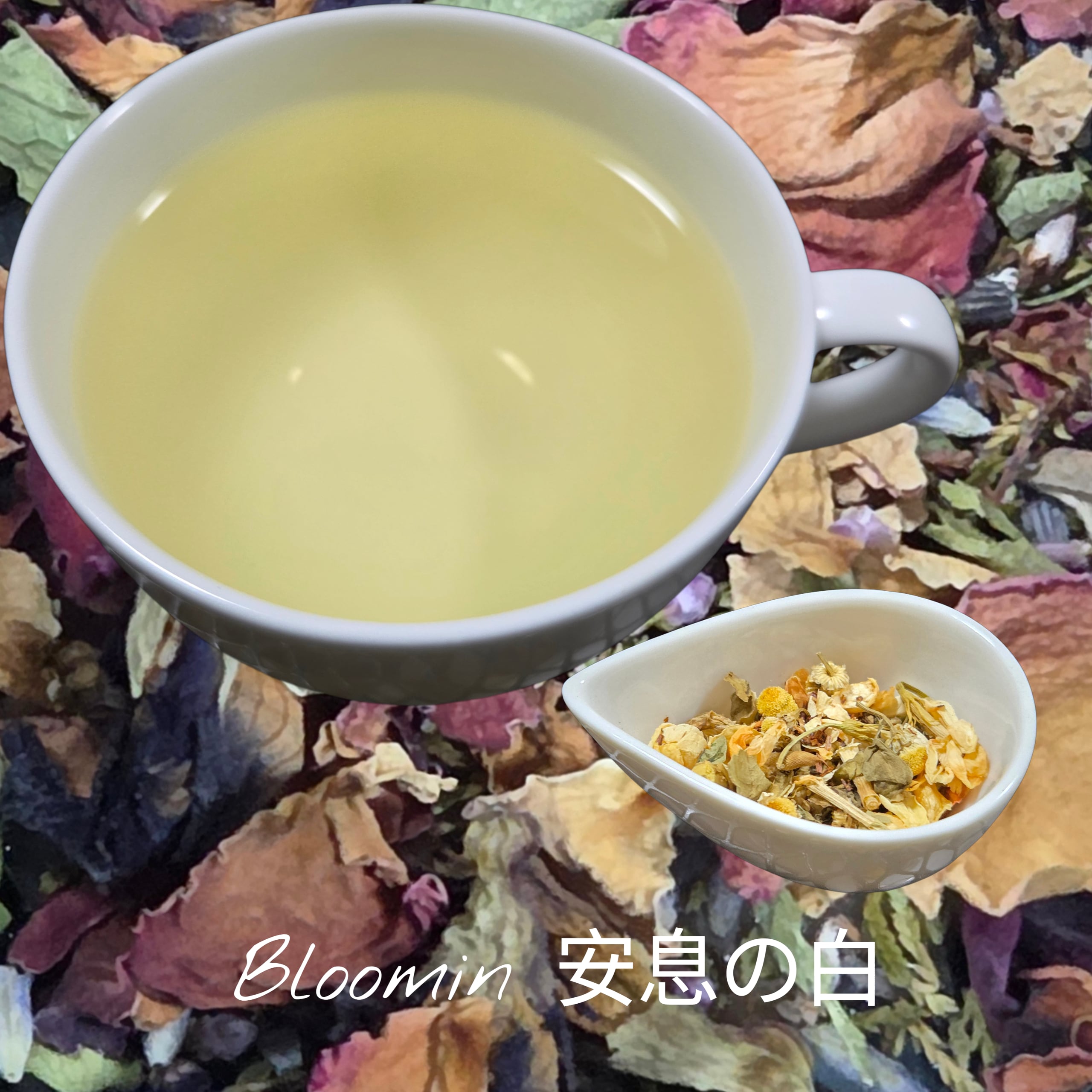 白はジャスミン、カモミールジャーマン、枸杞葉をブレンド。水色は淡い黄色のお茶に仕上げてみました。